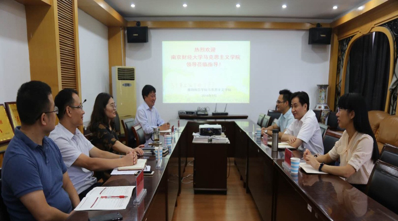 院长管爱花教授首先向我们介绍了学院历史沿革、科学研究、队伍建设、平台设置等方面的基本情况。副院长姜强强围绕本科生人才培养、思政课教学改革进行了深入交流。学科带头人朱荣贤教授就马克思主义理论学科建设的经验和做法向我们作了介绍。