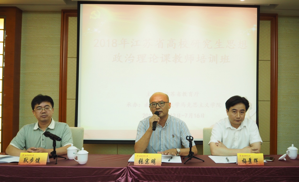 王伟处长致辞。他介绍了当前高校研究生思政课的建设环境、面临的挑战和发展目标;指出党的十八大以来,党中央对思想政治理论课高度重视,江苏省委宣传部和教育厅着力提升省内高校教师思政课教学能力和水平。他认为此次培训班的举办有三个重要意义:一是让教师通过培训进行自我“充电”,二是同行之间能够进行充分地交流,三是让教师们在紧张的工作之余进行适度调整。
