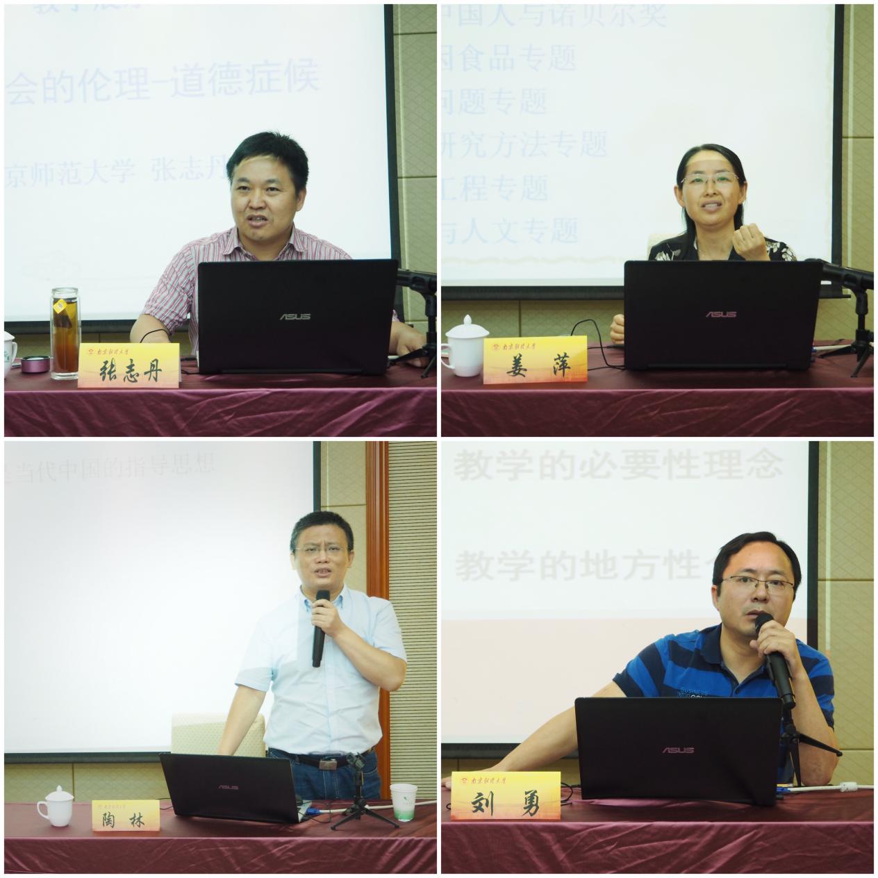 7月15日下午,南京师范大学张志丹教授、南京农业大学姜萍副教授、河海大学陶林副教授以及扬州大学刘勇副教授向学员们进行了教学展示,教学展示由江苏省研究生思想政治理论课教指委副主任张宗明教授主持。张志丹教授教学展示的主题为“现代社会的伦理——道德症候”,他从伦理与道德的概念之分、无伦理的道德与无道德的伦理及两者悖论原因三个方面出发,揭示了现代社会伦理道德悖论的出现所具有的深刻社会历史背景以及精神文化根源。姜萍副教授教学展示的主题为“自然辩证法概论”,她从人在自然界中的地位、人与自然关系的历史、人与自然关系的反思、人与自然关系的调整四个部分出发,进行了论述与展示。陶林副教授教学展示的主题是“当代青年与马克思的对话”,他从“马克思主义过时了吗”、“千年思想家马克思”、“青年人需要学习马克思吗”、“学什么”以及“怎么学”五个方面展开教学,阐述青年应该如何学习马克思主义。刘勇副教授教学展示的主题为“中国特色社会主义理论与实践研究”,他从教学的前置性条件、必要性理论以及教学的地方性个案三个方面进行阐述。