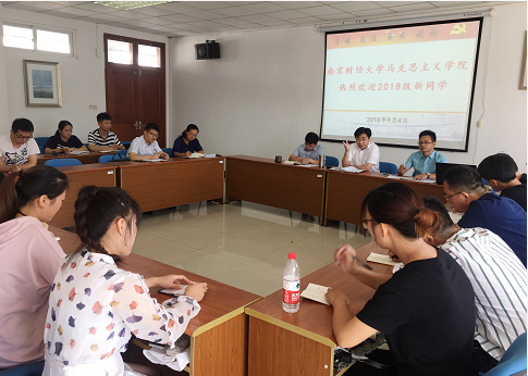 和南财马院的历史与现状,希望在座新生学通过四个回归(回归经典著作,回归生活世界,回归常识与平常心,回归初心与梦想)形成“四个自信”(学科自信、专业自信、文化自信、生活自信)。他对新生今后的研究生生涯提出了几点要求,一是要与导师之间建立良好的师生关系并形成默契;二是在学习与生活之间、个人与同学之间做到有效的平衡;三是要学会阅读经典,并做到史、著、论、传相结合;四是每个人都要善于规划自己,进入集体中要以学习作为价值导向,生活规范上必须严格遵守纪律,严格要求自己。他强调每个人都要积极主动,积极参加并投入到学院和青年马克思主义协会的各类学术讲座与各类活动之中,并且希望大家能够尽快融入环境。