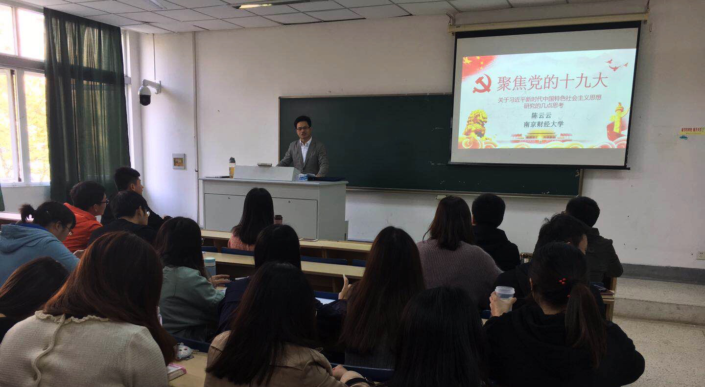 陈老师指出,习近平新时代中国特色社会主义思想是马克思主义中国化最新成果,有着坚实的理论支撑和深厚的实践基础,既为我们走好新时代的长征路、建设社会主义现代化强国、实现中华民族伟大复兴的中国梦提供了强大思想武器和行动指南,也为解决人类问题贡献了中国智慧和中国方案。接着,他从文化自信、社会主要矛盾转变、习近平新思想的内涵、生态文明建设、人类命运共同体、新发展理念、社会主义核心价值观、劳模精神、中华民族共同意识、总体国家安全观、党建、人民为中心的发展观、青年问题、意识形态领导权等十四个方面对《党的十九大报告》中所展现的热点话题进行了详细解读,向与会研究生阐明了学术研究的新领域和新方向。