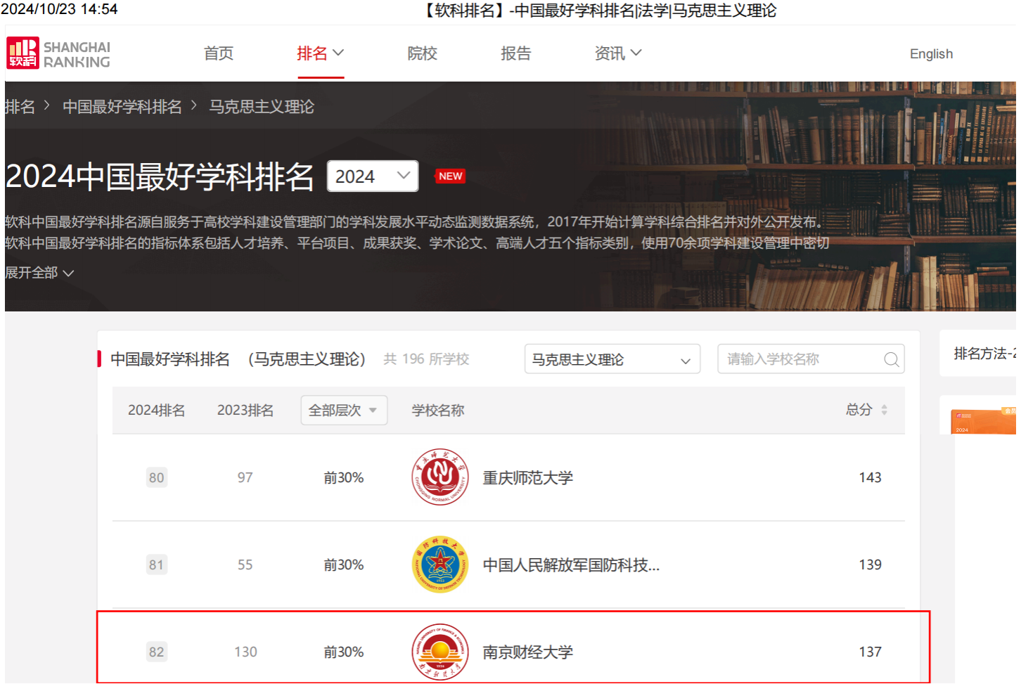 马克思主义理论学科等级为B(全国前30%),在全国高校中排名第82,相比于2023年上升了48名(2023年排名为130名);在全国财经类高校中排名第7。