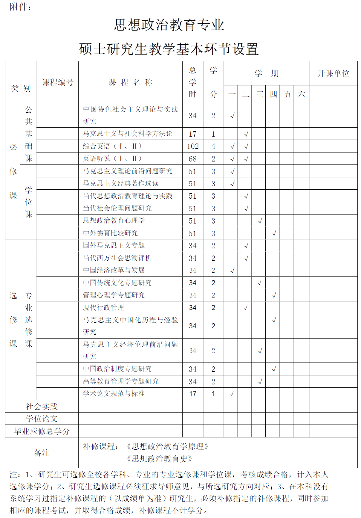 注:每位硕士研究生必须按照各教学基本环节规定的学分进行必修或选修,且每一环节的学分不得用其它环节的学分替代,修满的总学分为45。