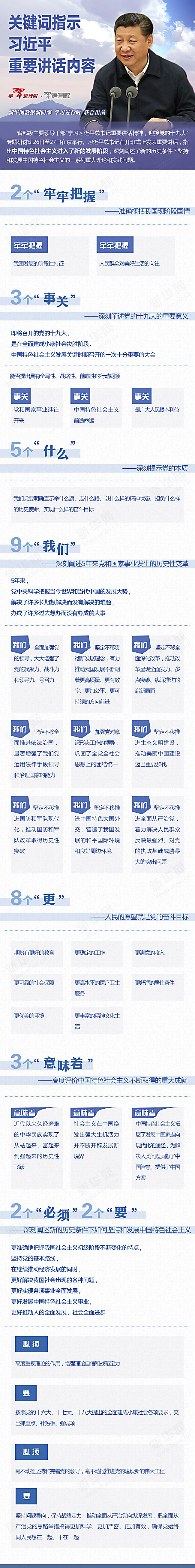 习近平指出,党的十八大以来,在新中国成立特别是改革开放以来我国发展取得的重大成就基础上,党和国家事业发生历史性变革,我国发展站到了新的历史起点上,中国特色社会主义进入了新的发展阶段。中国特色社会主义不断取得的重大成就,意味着近代以来久经磨难的中华民族实现了从站起来、富起来到强起来的历史性飞跃,意味着社会主义在中国焕发出强大生机活力并不断开辟发展新境界,意味着中国特色社会主义拓展了发展中国家走向现代化的途径,为解决人类问题贡献了中国智慧、提供了中国方案。全党要提高战略思维能力,不断增强工作的原则性、系统性、预见性、创造性,按照新要求制定党和国家大政方针,完善发展战略和各项政策,以新的精神状态和奋斗姿态把中国特色社会主义推向前进。