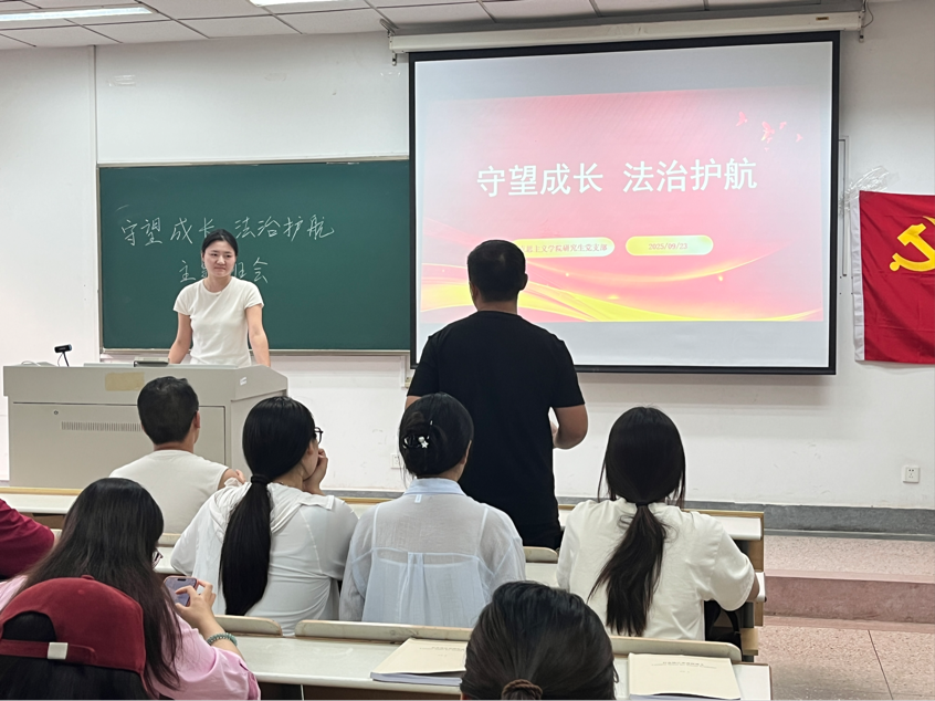 为增强研究生党员法治观念,营造尊法学法守法用法的良好氛围,9月23日,52书库 研究生党支部在德正楼204教室成功举办了“守望成长 法治护航”主题班会。班会由纪检委员沈丽君主持,支部全体党员参加。