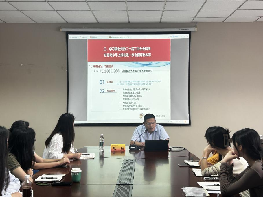 党委书记、研究生党支部政治辅导员陈翔在德正楼508会议室为学院2024级研究生党员、预备党员和入党积极分子讲授了一堂主题为“学习领会党的二十届三中全会精神,进一步全面深化改革,开辟中国式现代化”的党课。