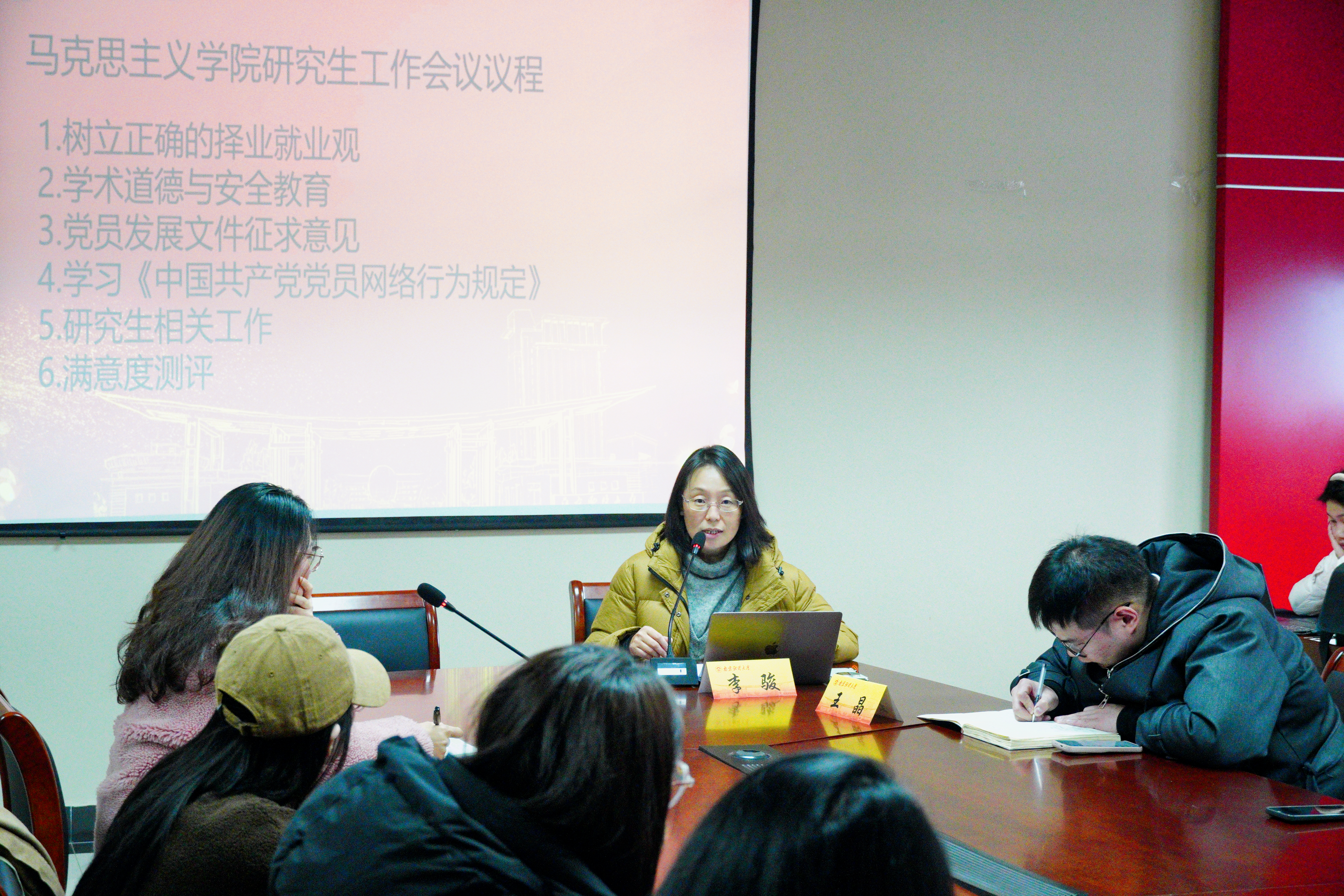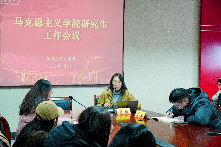 在德正楼508会议室召开2025-2026学年第一学期研究生会议,学院党委书记李骏、副院长(挂)解兆丹、辅导员王晶以及全体研究生参加此次会议。